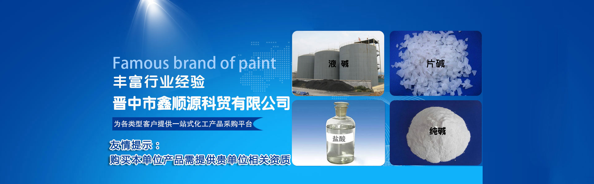 晉中市鑫順源科貿有限公司成立于2012年9月4日,位于榆社縣東大街大寺路,有安監局頒發的中華人民共和國危險化學品經營許可證和非藥品類易制毒化學品經營備案證明,主要經營鹽酸、次氯酸鈉、液堿 、 片堿  、純堿 、  硫酸 、 聚合氯化鋁、 氯化鈣、氯化鋇、氯乙酸、氨水、水處理劑等危險化學品的銷售及運輸......